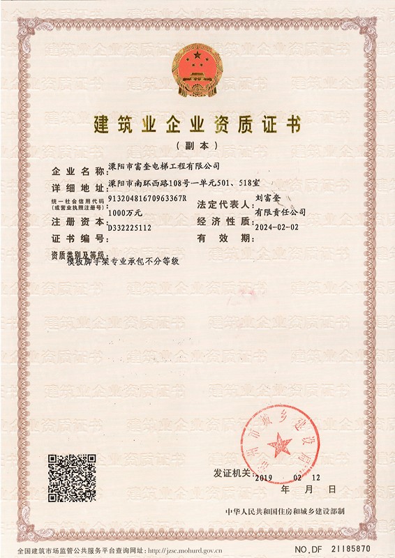 溧陽(yáng)市富奎電梯工程有限公司 溧陽(yáng)市富奎電梯工程有限公司是于二OO八年一月九日在原前身溧陽(yáng)市電梯工程公司基礎(chǔ)上成立的,是專(zhuān)業(yè)從事電梯銷(xiāo)售安裝維修、保養(yǎng)的企業(yè)。是國(guó)家質(zhì)監(jiān)總局頒發(fā)的特種設(shè)備安裝、改造、維修A級(jí)安裝許可證單位。公司組織機(jī)構(gòu)實(shí)行總經(jīng)理負(fù)責(zé)制,公司下設(shè)管理部、銷(xiāo)售部、安裝維修部、質(zhì)安部、財(cái)務(wù)部,公司另外設(shè)十二個(gè)分公司:四川分公司、江蘇分公司、上海分公司、浙江分公司、湖南分公司、遼寧分公司、山東分...
